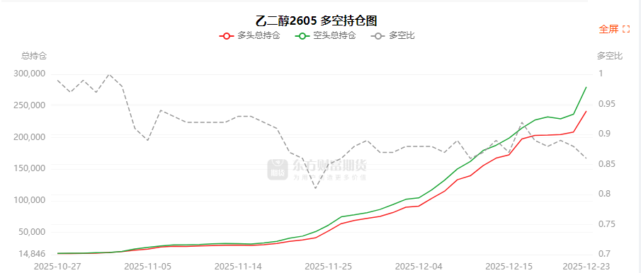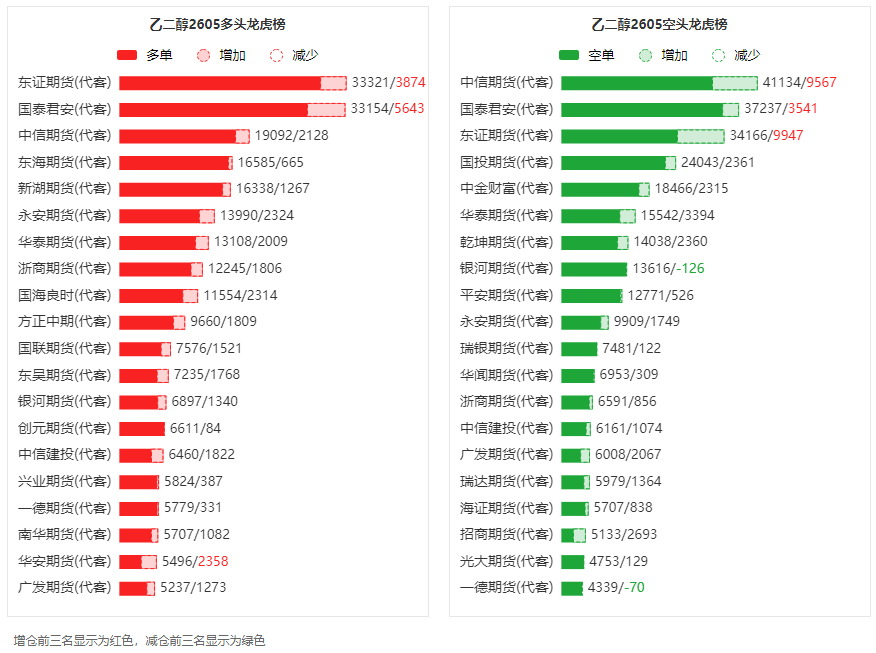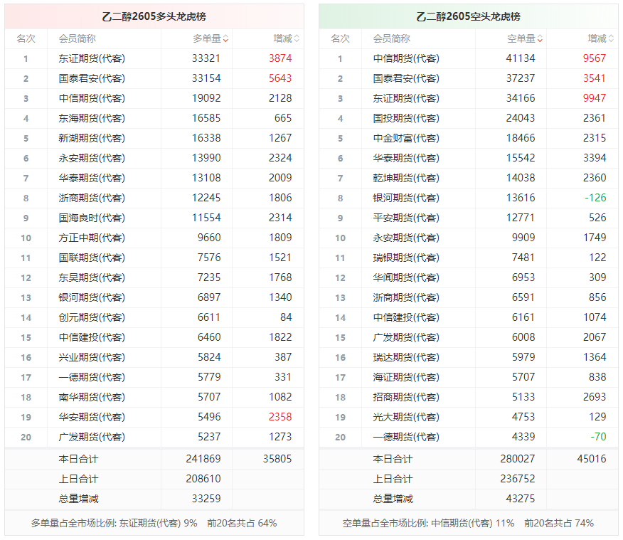 总体而言,乙二醇2605合约今日增仓下行,多空持仓排名前20席中,多空双方均呈进场态势,多头进场意愿弱于空头。
