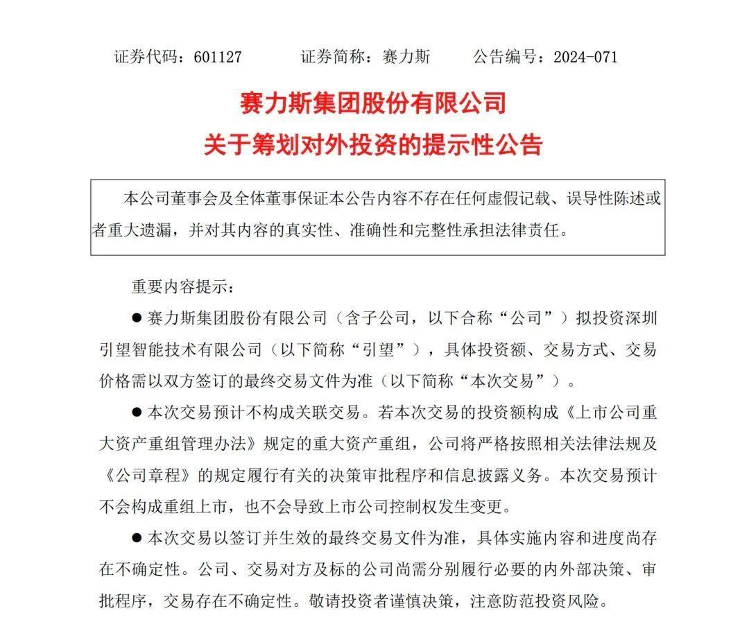 公告显示,赛力斯拟投资深圳引望智能技术有限公司(以下简称"引望"),具体投资额、交易方式、交易价格需以双方签订的最终交易文件为准。若本次交易完成,引望将成为赛力斯参股子公司,但公司合并报表范围不会发生变化。